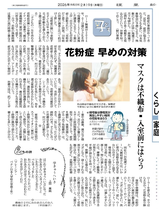 - お知らせ, メディア 2026.02.20 読売新聞から「子どもの一生を決める花粉症対策」著者の村川哲也先生が取材を受けました。